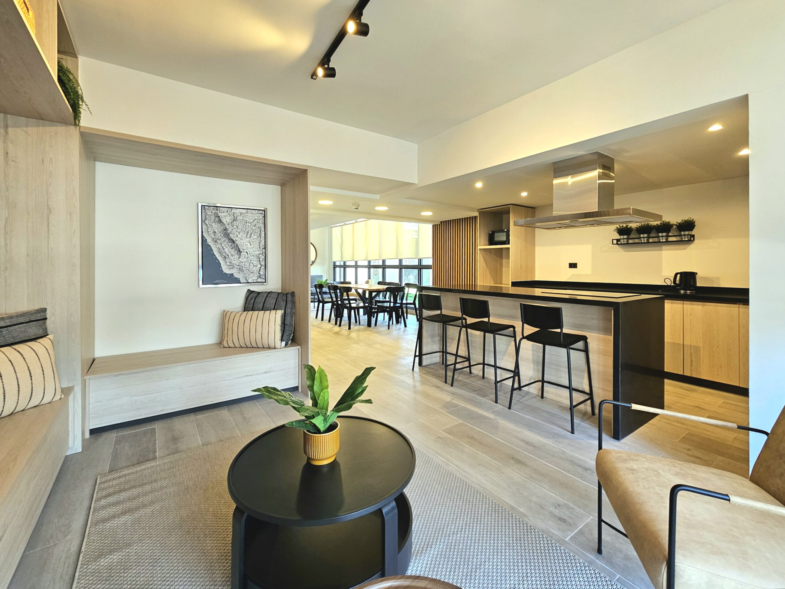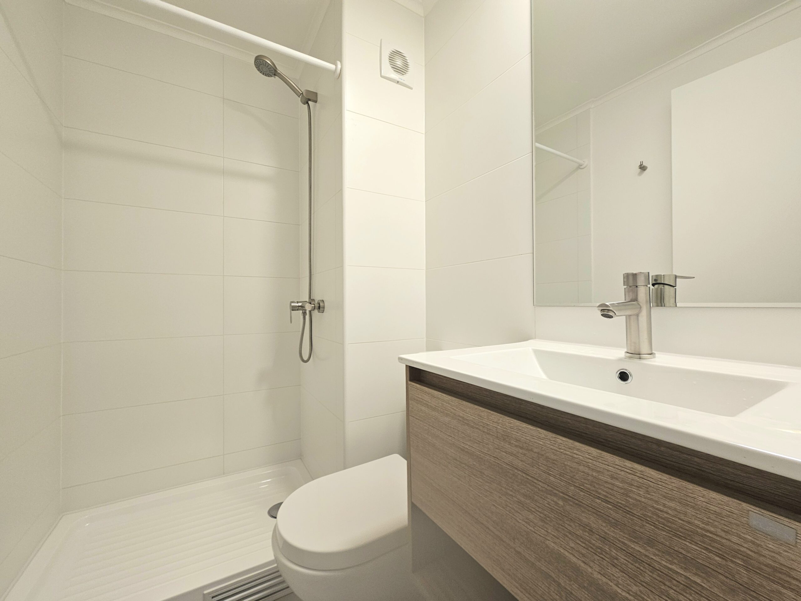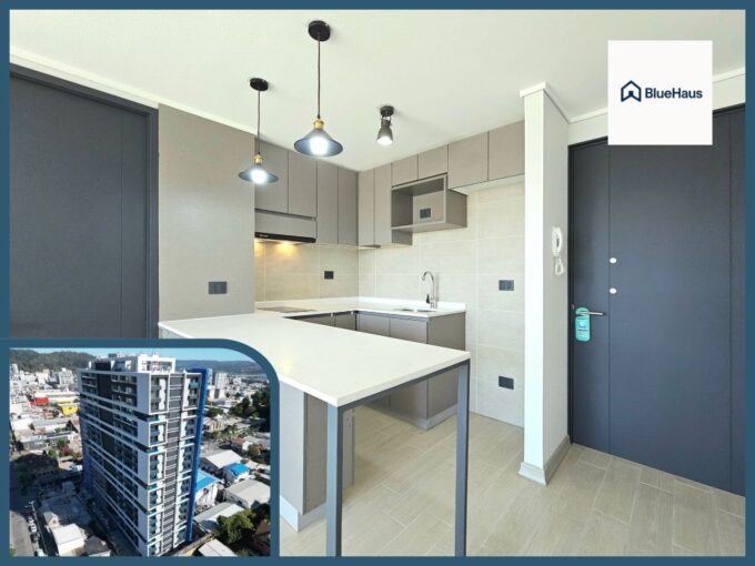 Situado en el piso 5, con muy buena iluminación natural. Cuenta con cocina full equipada con encimera y horno, y el edificio ofrece espacios comunes de primer nivel: gimnasio, cowork, sala de eventos, sala e-commerce y lavandería.