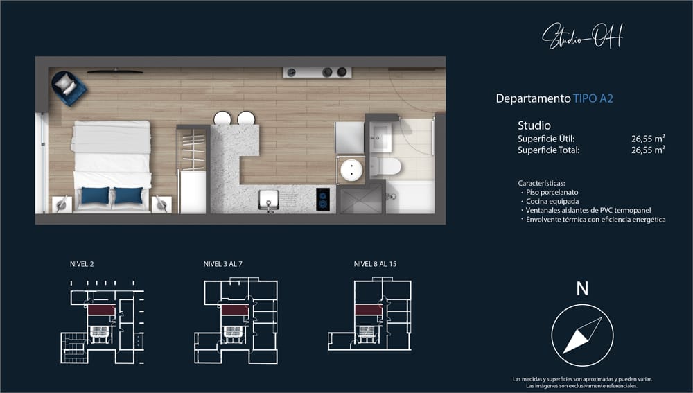 Moderno departamento tipo estudio (1 ambiente) en arriendo en Orompello con Rozas, en edificio Studio OH, ubicado a pasos de servicios, a pasos de locomoción colectiva, 200 metros de Av. Los Carrera, a 300 metros de McDonald’s Automac de Carrera, 800 metros de la Universidad San Sebastián. Perfecto para estudiantes o jóvenes profesionales que buscan independencia, comodidad, y cercanía a todos los servicios.